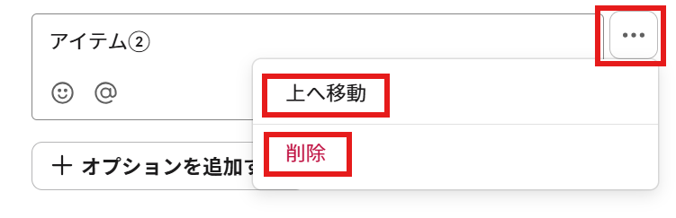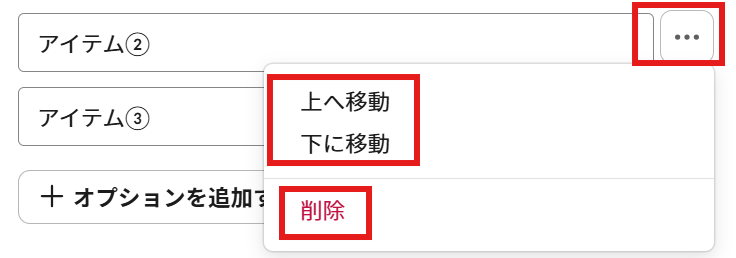 ドロップダウンと同じく選択肢(オプション)は右の「・・・」から上下に移動、削除ができます。
