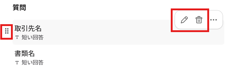 一度作成した質問の編集(鉛筆マーク)や削除(ゴミ箱マーク)ができ、左側からドラッグ&ドロップで質問の順番を変更できます。