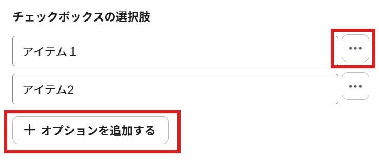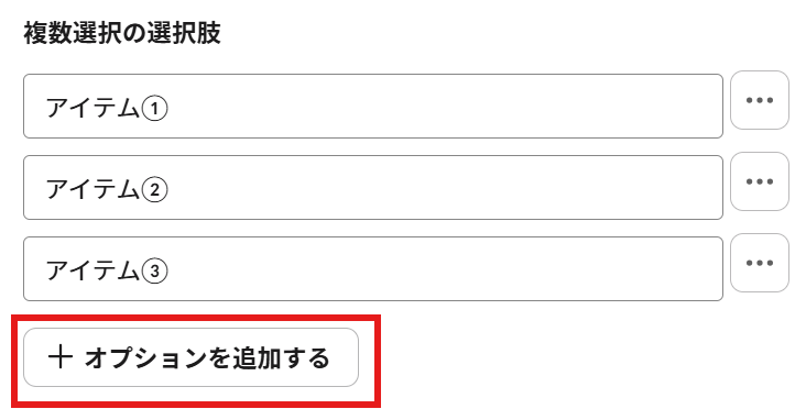 複数選択肢に似ているところとして、オプションを追加することで選択肢を増やせます。また、同じく選択肢(オプション)は右の「・・・」から上下に移動、削除ができます。