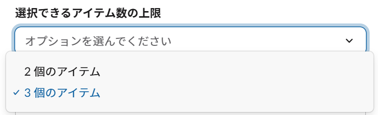 選択できるアイテム数(オプション)の上限の設定ができます!1個だけは設定できず、2個以上からになります。