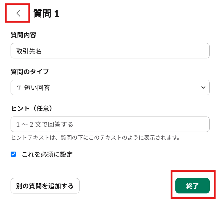 - これを必須に設定:チェック入れると、その質問の回答が必須になります