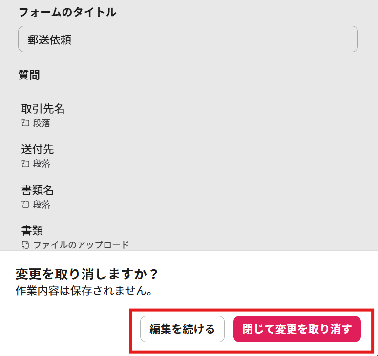 間違ってキャンセルをクリックしても「編集を続ける」のボタンで、前の画面に戻ります。やはり編集を取り消したい場合は「閉じて変更を取り消す」ボタンをクリックします。