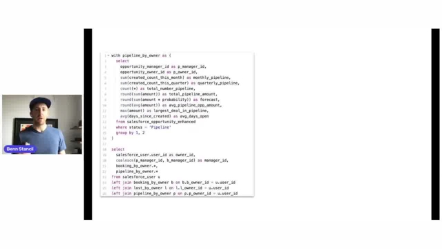 誰かが、Salesforceのデータをクリーンアップして、チームのパフォーマンスを簡単に評価する方法を見つけたとします。これは実際にFivetranが行ったことです。スライドのクエリはFivetranが実行しているものからコピーしたものです。
