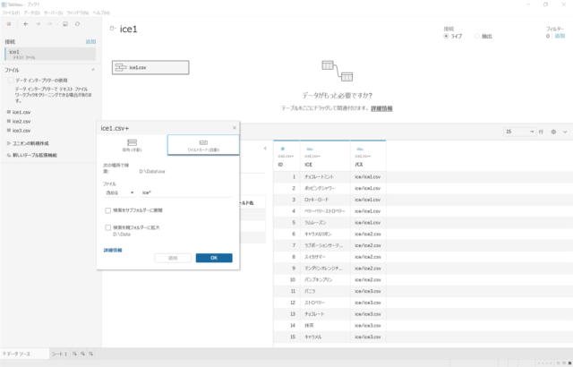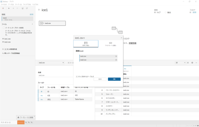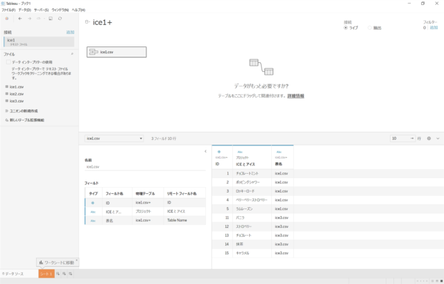 Tableau DesktopでCSVファイルのデータを読み込みます。今回はice1.csvというファイルを読み込んでいます。ice1.csvのほかに、同じフォルダにあるice2.csvが左ペインに一緒に表示されています。