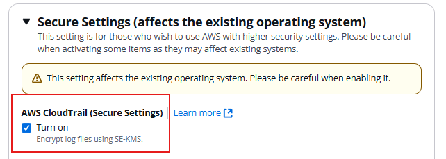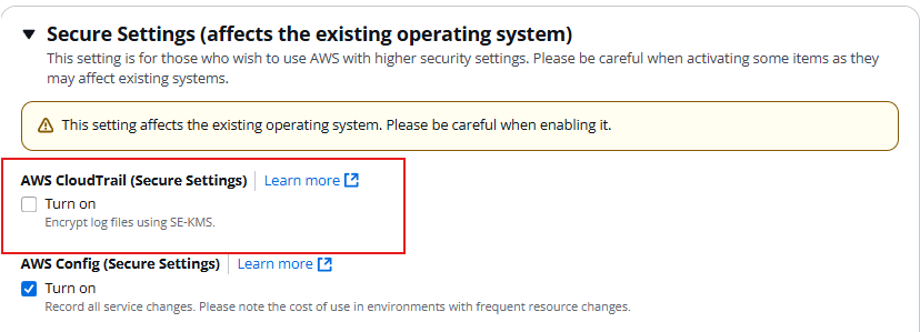 - ที่หัวข้อ "Secure Settings (affects the existing operating system)" ให้ติ๊กเปิด ของ "AWS CloudTrail (Secure Settings)" อีกครั้ง