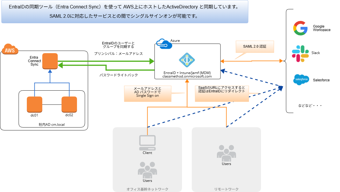今回設定したシングルサインオンの構成を図で示します。SAML2.0認証が可能なSaaSについて今後追加されていくことになります。