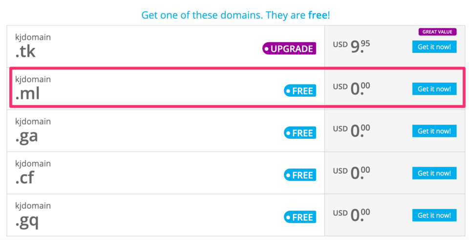 FREE라고 쓰여있는 도메인이 무료 도메인이기 때문에, kjdomain.ml 라인에 있는「Get it now!」를 클릭합니다.