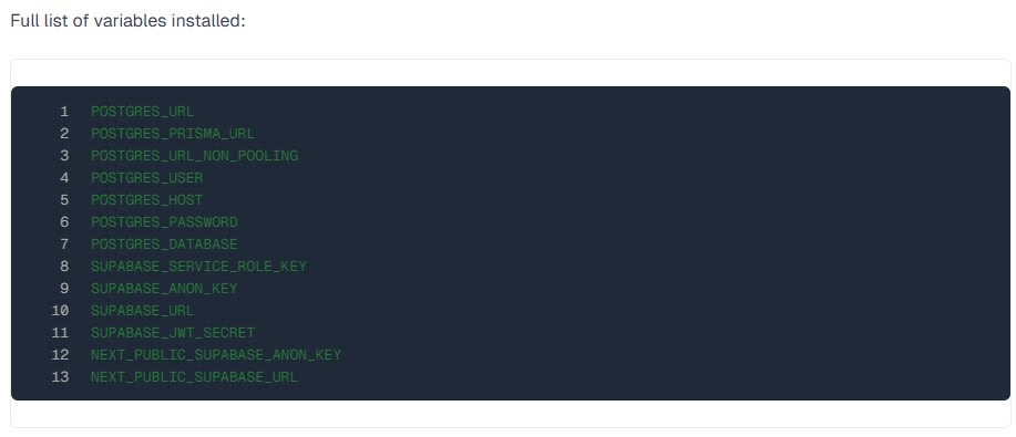 Integration が設定する環境変数には、NEXT_PUBLIC_SUPABASE_URL と NEXT_PUBLIC_SUPABASE_ANON_KEY が含まれます。