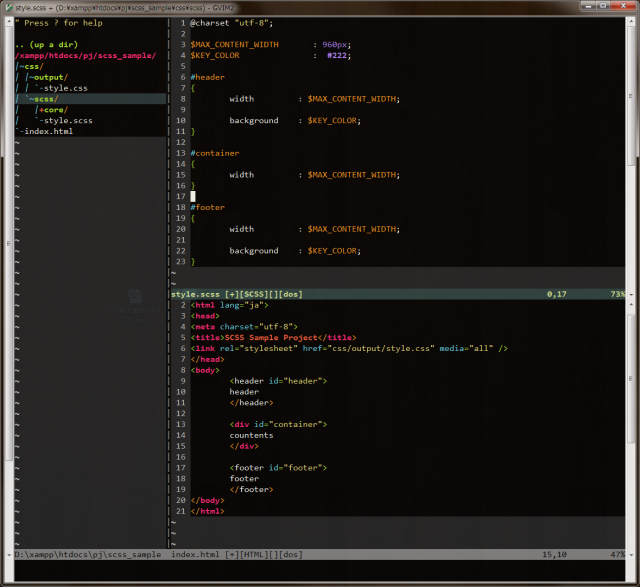 ちなみにSassには2つの構文があり、SCSS(Sassy CSS)とSass(インデント構文)に別れます。SCSSは.scssという拡張子、Sassは.sassという拡張子を持ち、お互いにSass-convertコマンドラインツールを使うことで変換もできますし、どちらの構文で書かれたとしてもインポートできます。