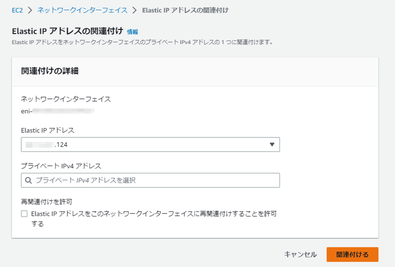 先ほど作成したElastic IPを選択し、「関連付ける」を押下することでアタッチします。