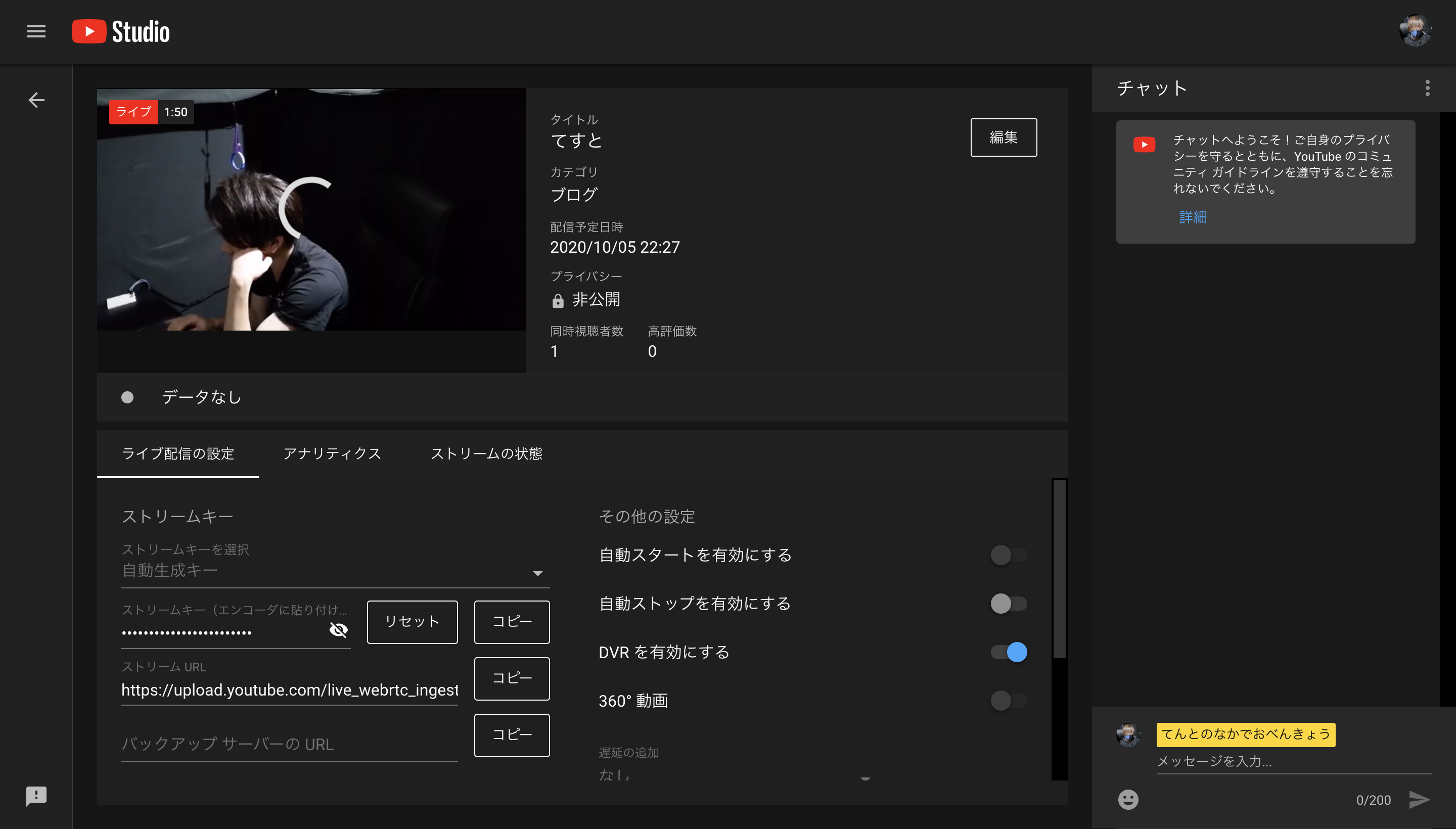 以前この現象が発生した時、対処法が分からなかったので、仕方なくライブ配信を削除したことがありました。悲しい。んで、またまた同じ現象が発生してしまい、試行錯誤ごにょごにょしていたらリベンジ成功しました。嬉しい。今後は安心してライブ配信に臨めそうです。