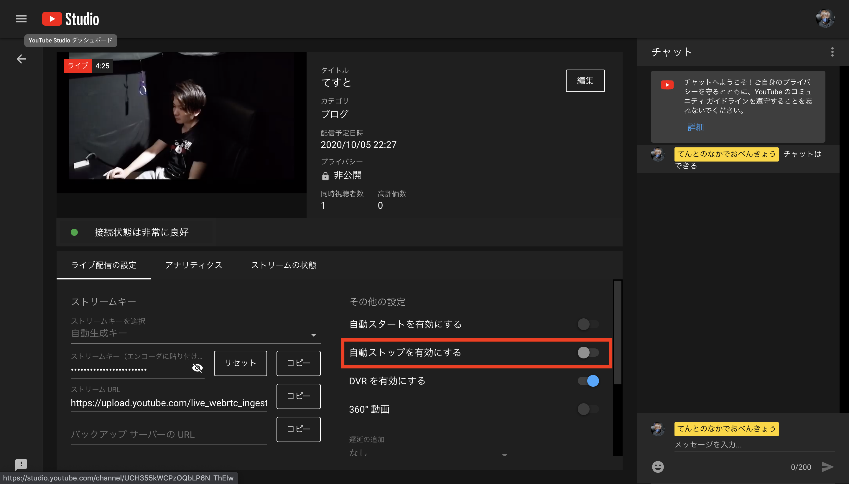 YouTube Live 側のページにて、「接続状態は非常に良好」と表示されていれば OK です。先ほどまで表示されていたく〜るくるが無くなり、ライブ配信が再開されます。