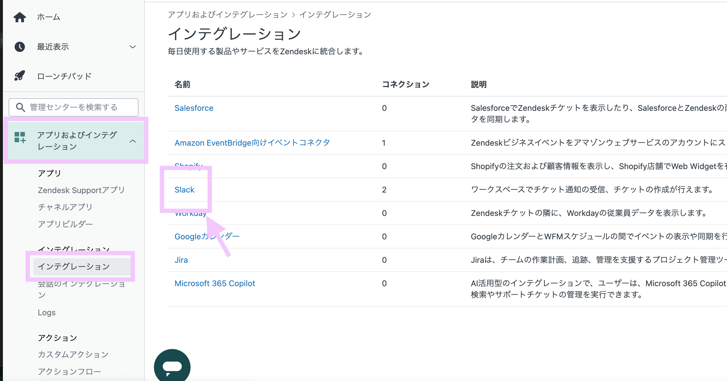 サイドバーのアプリおよびインテグレーション> インテグレーションを選択します。