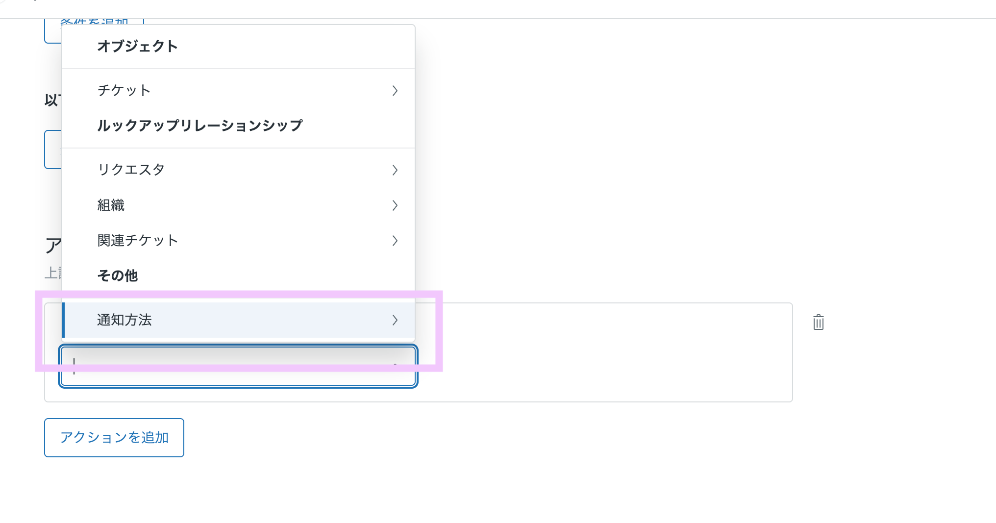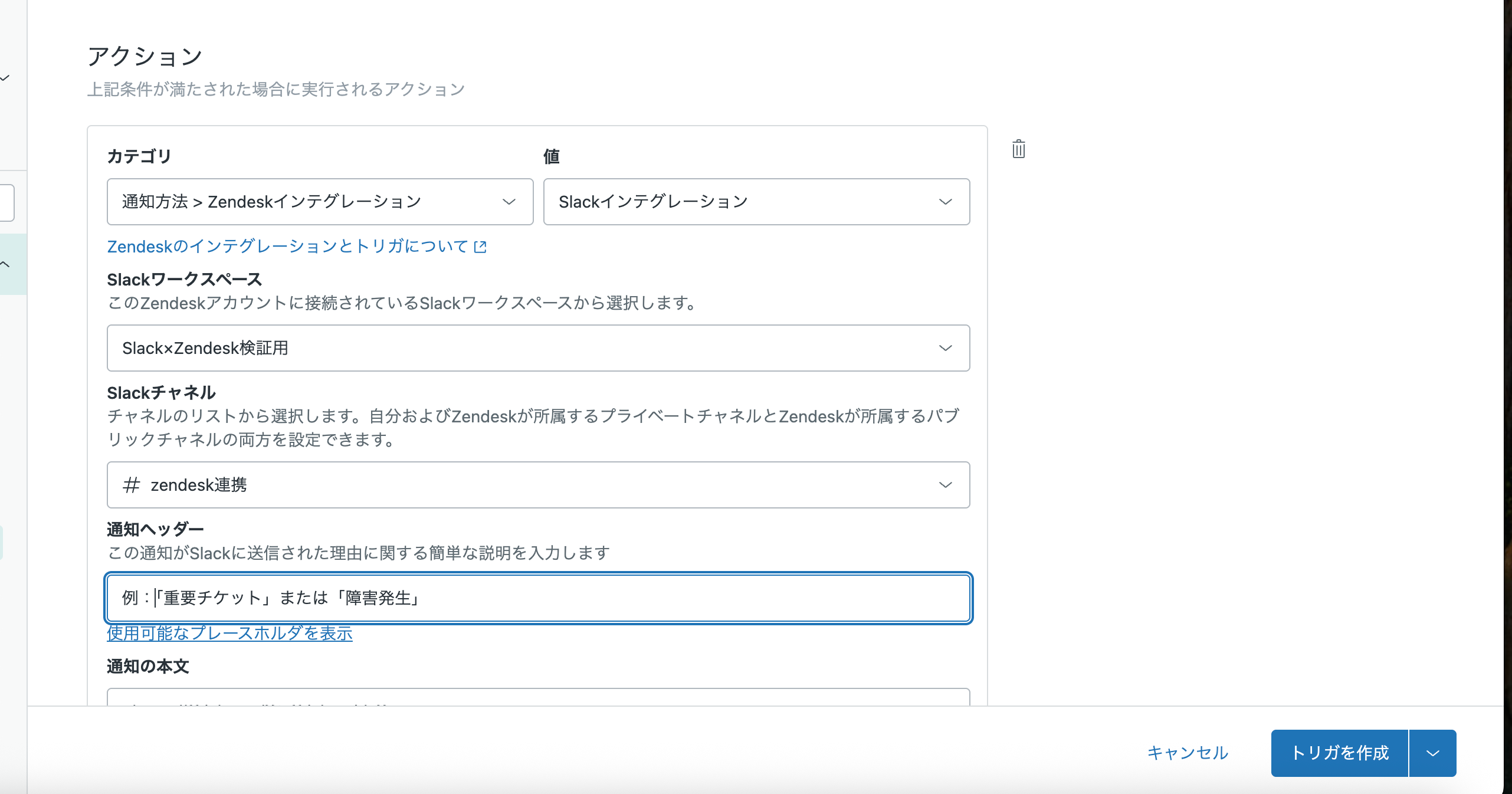 カテゴリに、通知方法>Zendeskインテグレーション を選択し、