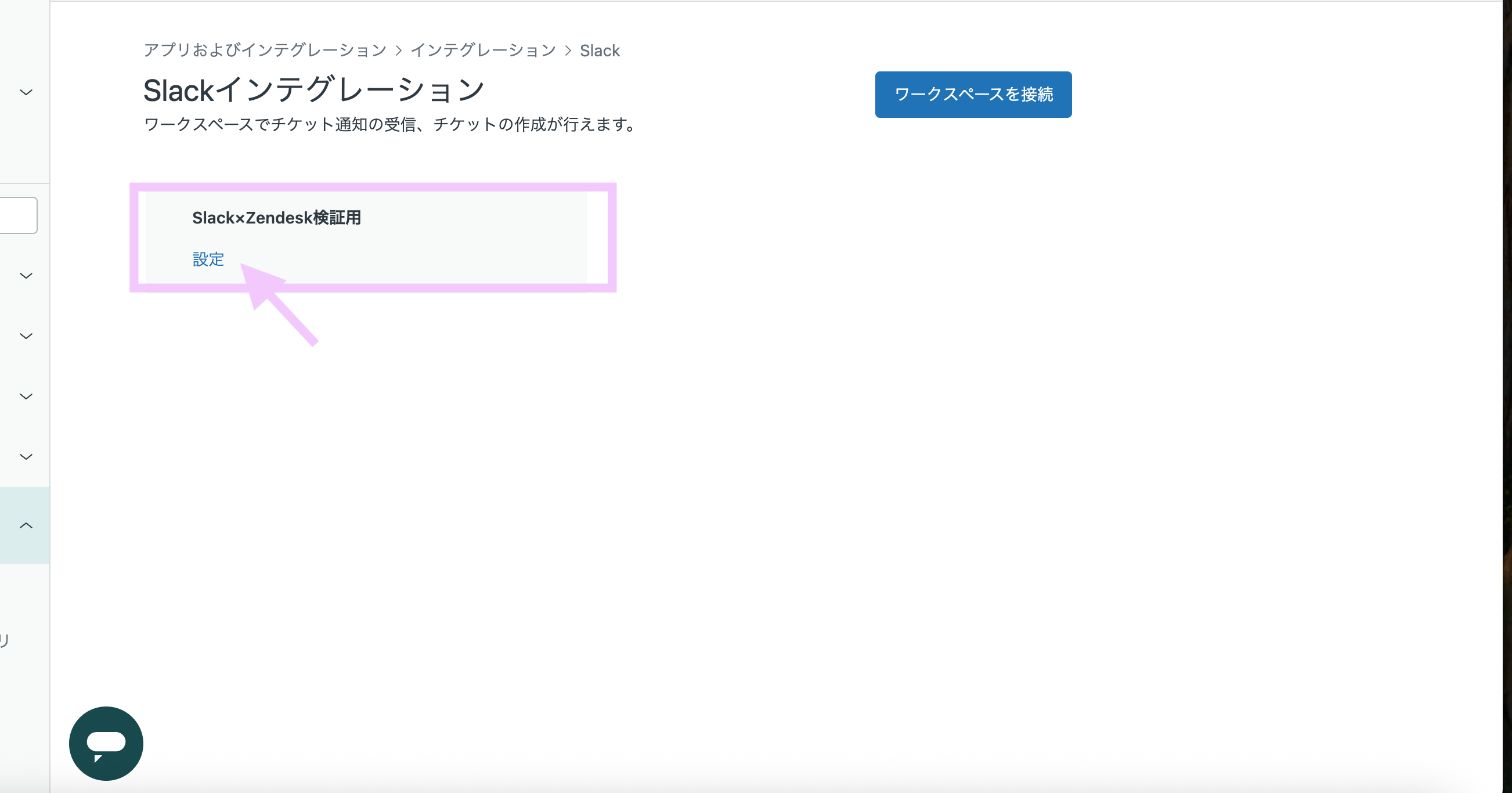 インテグレーション一覧から Slackの ワークスペースを接続 を選択します。