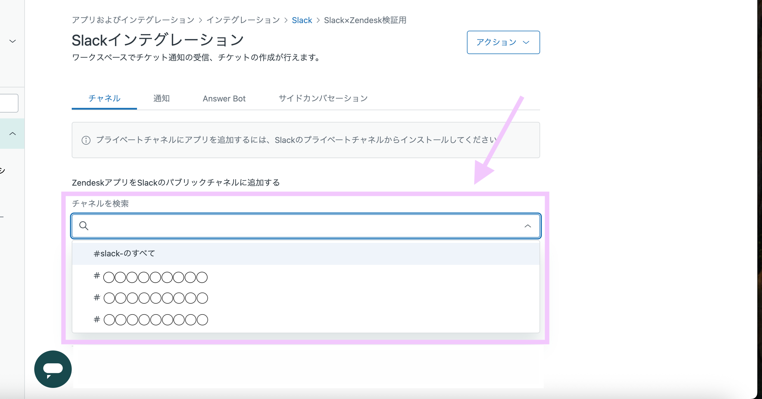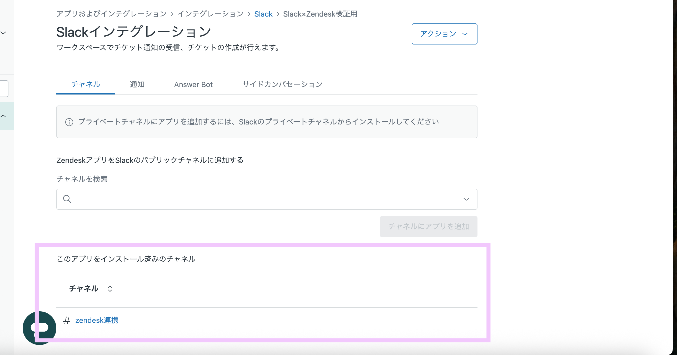 通知を受け取りたいSlackチャンネルにZendeskアプリを追加します。