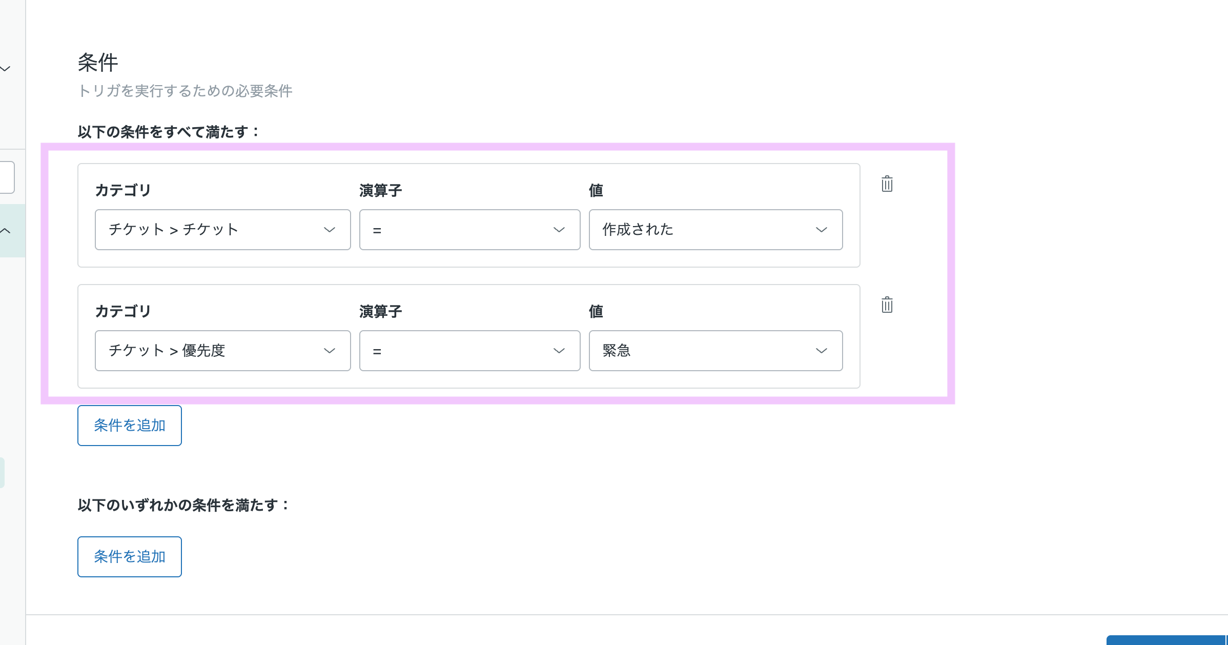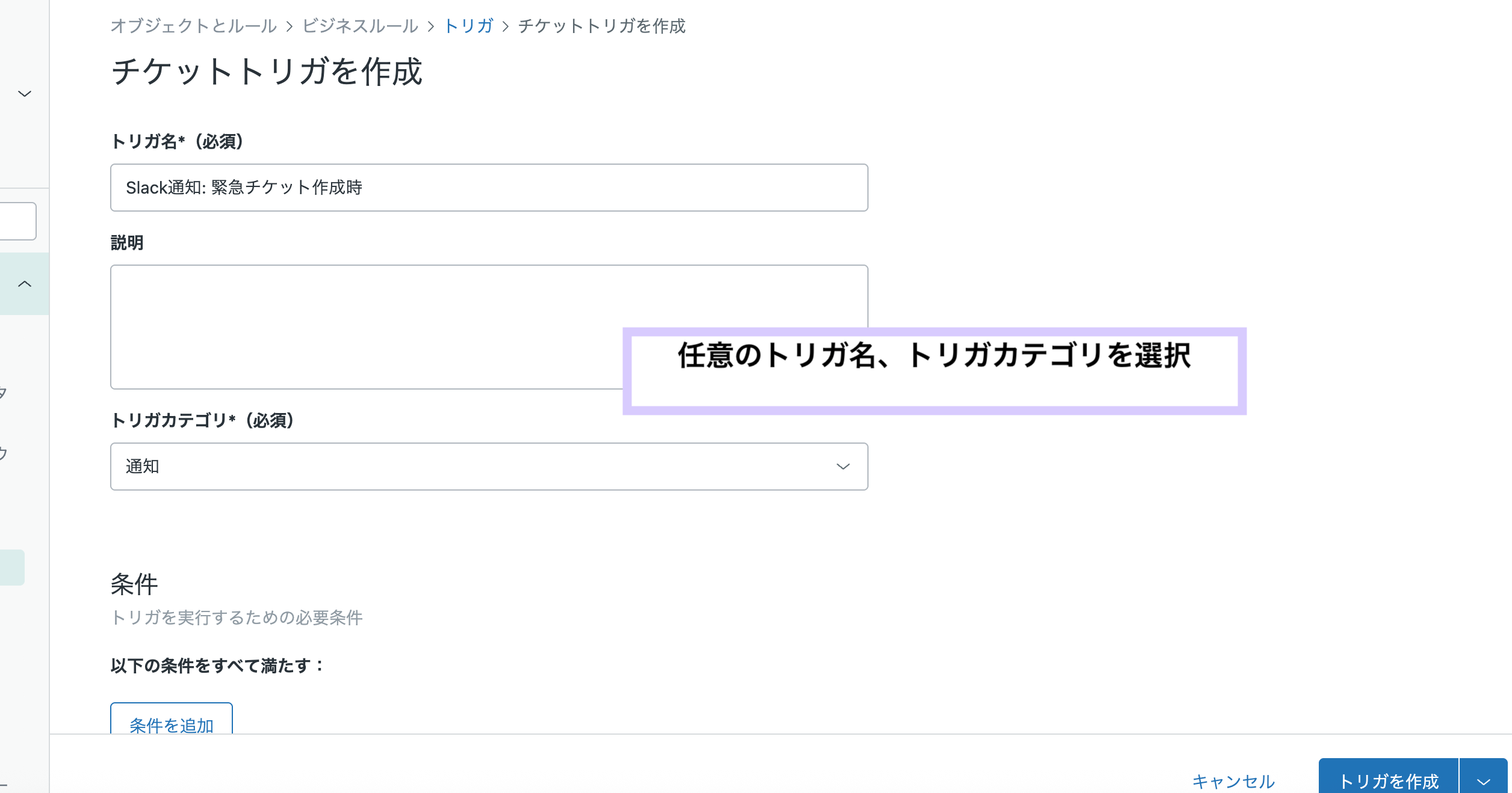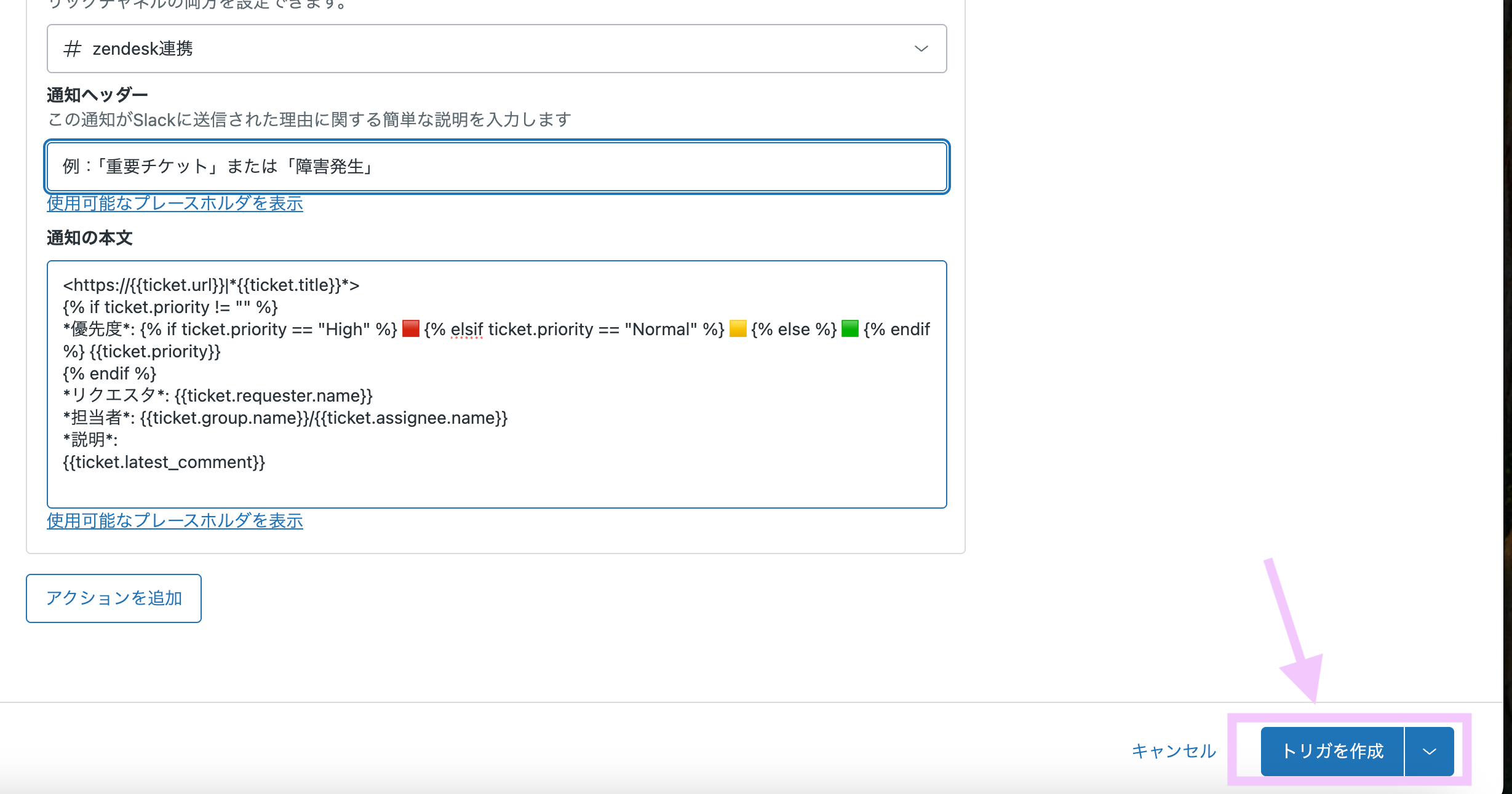 次に、「重要チケット」や「障害発生」といった特定の条件でSlackにリアルタイム通知を送るためのZendeskトリガを設定します。