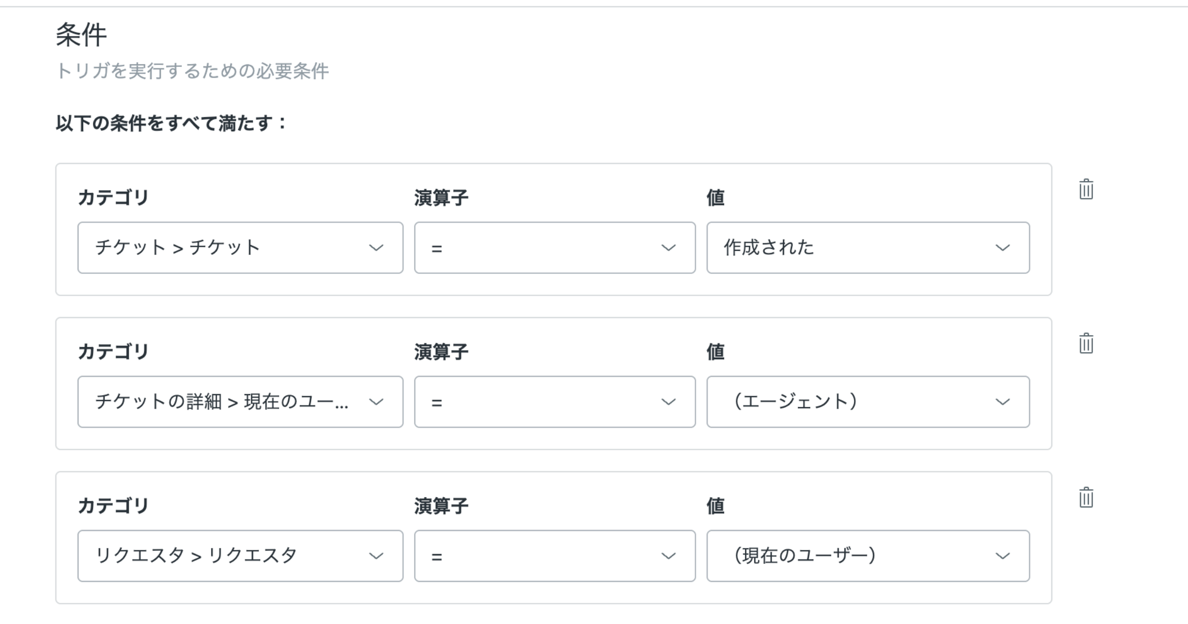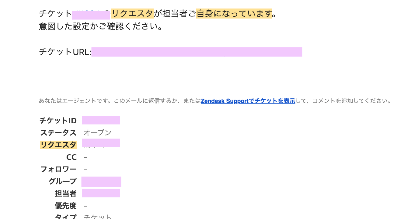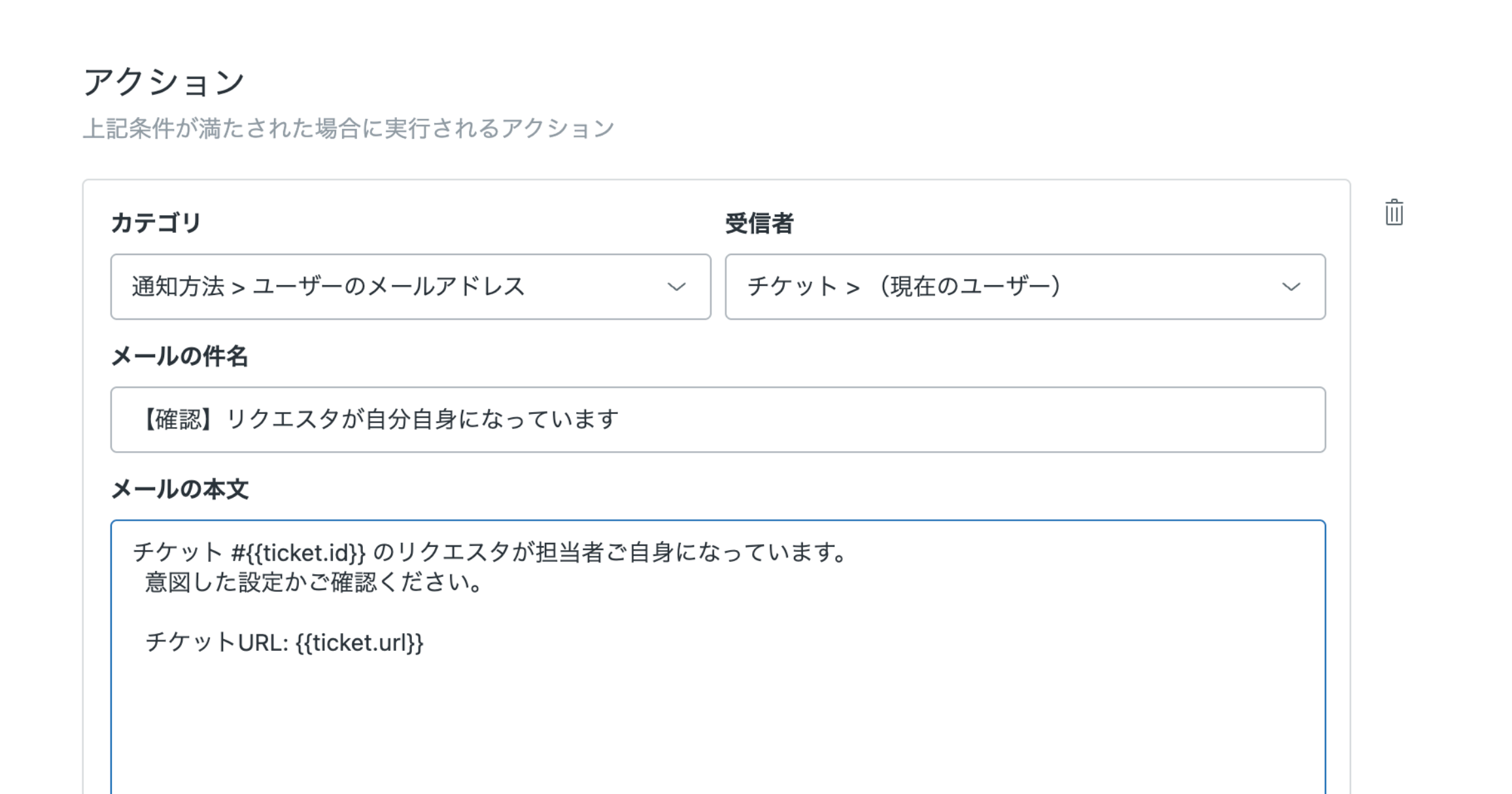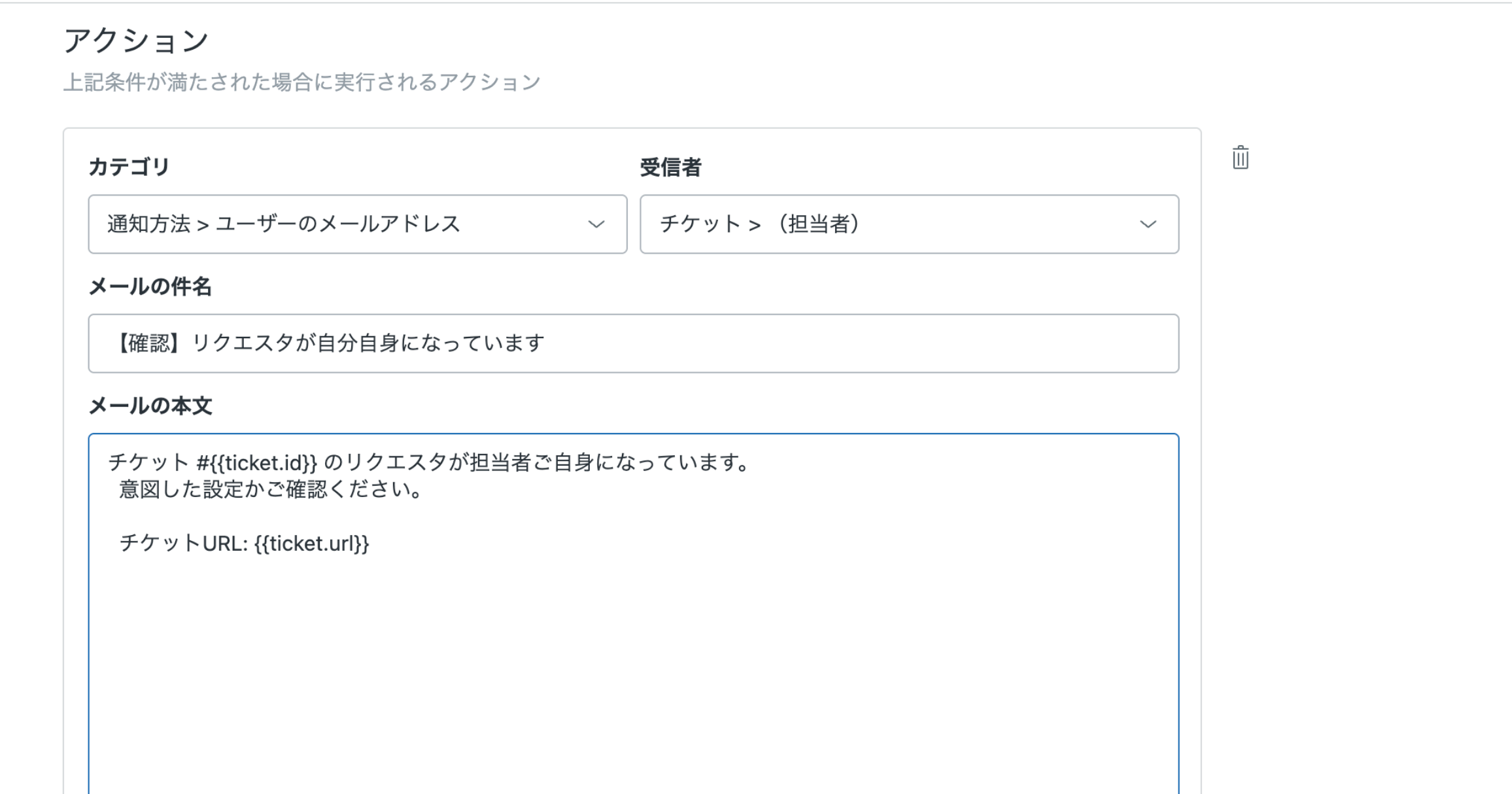 メールの本文:チケット #{{ticket.id}} のリクエスタが担当者ご自身になっています。