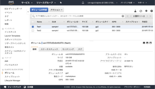 以下のようなタグが設定されている2個のEBSを作成しました。なおVolume1はKMSのCMKで暗号化しています。DLMタグがsample1の条件で検索できます。