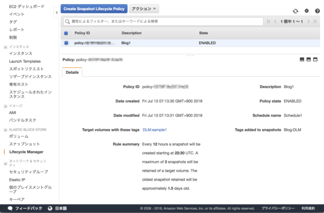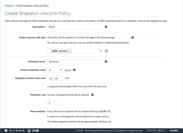 | Tag created snapshots | キー: Blog, 値: DLM | スナップショットに設定するタグ |