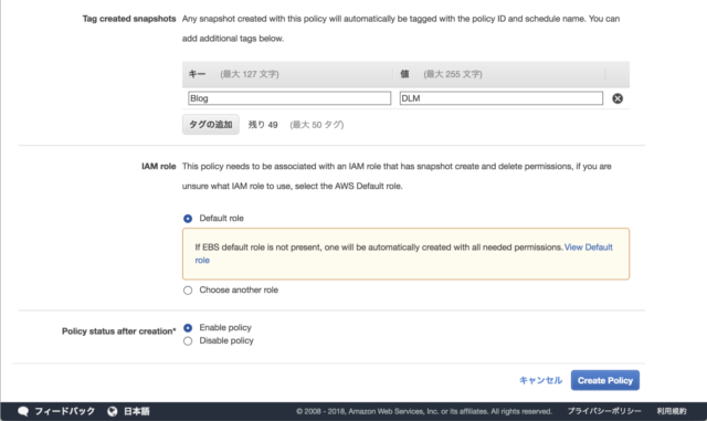 スナップショットに追加で設定するタグを指定します。また、DLMを実行するIAM Roleを設定します。Default roleを選択する場合、初回実行時にAWSDataLifecycleManagerServiceRoleというService-Linked Roleが自動で作成されます。CLIから実行する時には事前にaws dlm create-default-roleコマンドでRoleを作成しましょう。最後にCreate Policyをクリックします。